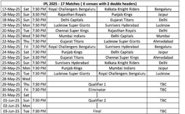 IPL 2025 Schedule: આઈપીએલ 2025 ફરી શરુ થવાની જાહેરાત કરવામાં આવી છે. આઈપીએલ 17 મે થી શરુ થશે. બાકીના 17 મેચ 6 સ્થળોએ રમશે . IPL 2025ની બાકીની મેચો બેંગલુરુ, જયપુર, દિલ્હી, લખનઉ, મુંબઈ, અમદાવાદમાં રમાશે. જોકે, ક્વોલિફાયર 1, એલિમિનેટર અને ક્વોલિફાયર 2 સિવાય, ફાઇનલ મેચનું સ્થળ હજુ સુધી નક્કી થયું નથી