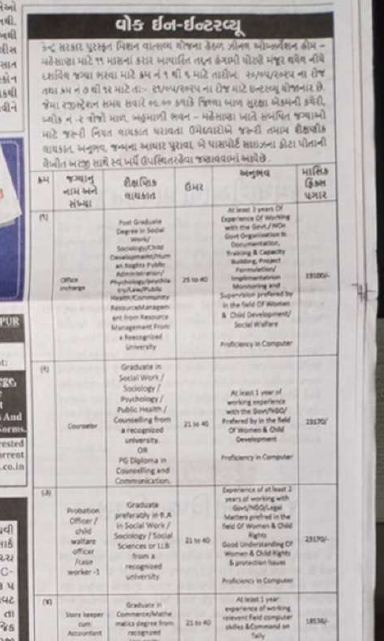 ઈન્ટરવ્યુ સ્થળ | જિલ્લા બાળ સુરક્ષા એકમની કચેરી, બ્લોક નંબર 2, ત્રીજો માળ, બહુમાળી ભવન, મહેસાણા |